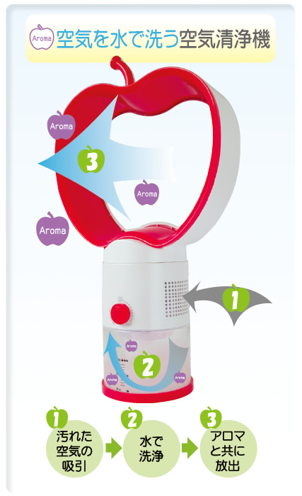 お部屋の汚れた空気を吸いこんで水で洗浄します。水には洗浄力を高めるアロマ成分が入っておりきれいな空気ととともに爽やかなアップルの香りが広がります。